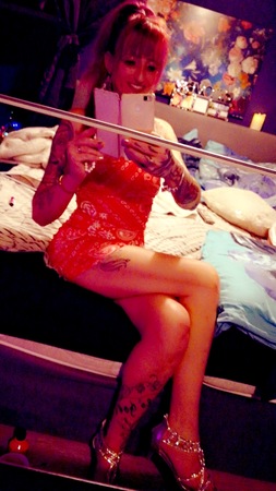| Körperschmuck: | Tattoos, Nabel-Piercing |