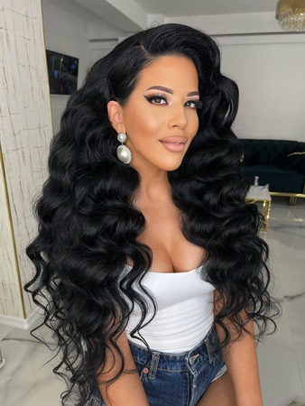 Haare:schwarz, rückenlang, glatt